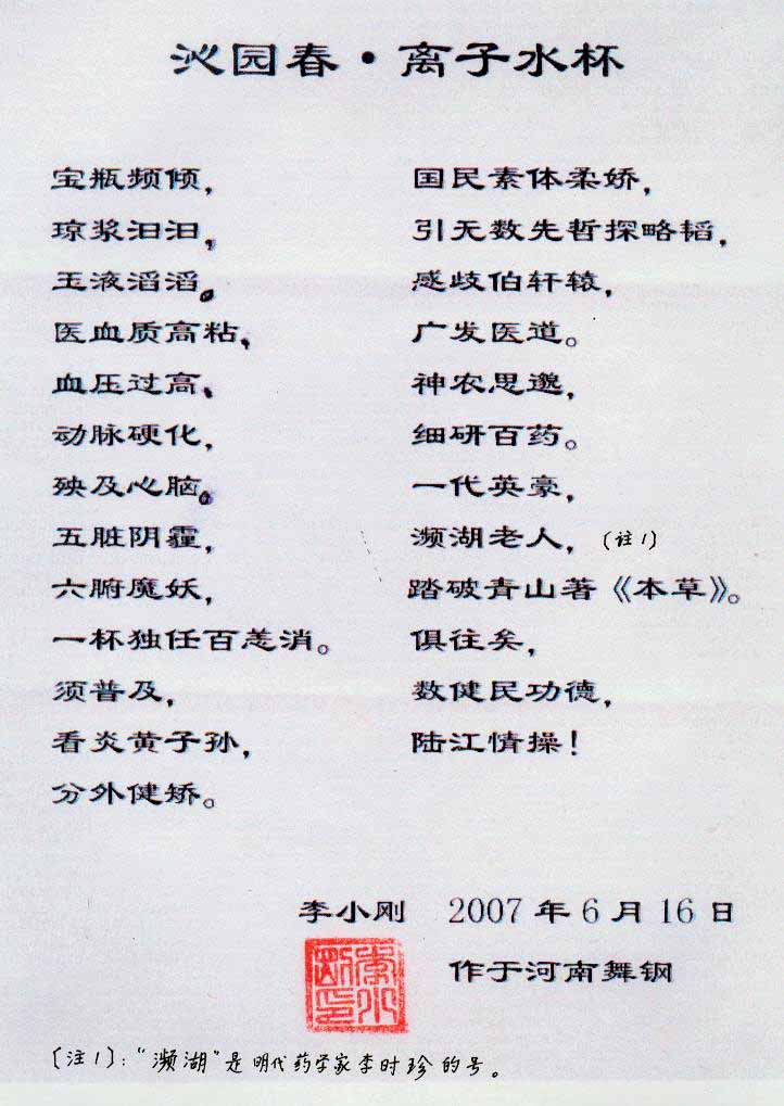 1. 本品倒入熱的或冷的開水,處理成富含4-6個水分子小簇團的微小分子團水。飲用后祛除上述疾病,包括各期原發性高血壓、單純收縮期高血壓、老年性高血壓、中過風和做過"搭橋"或"支架"的冠心病患者。